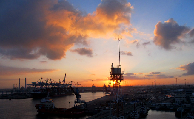 A beautiful sunrise hides behind the machinery of a busy industrial