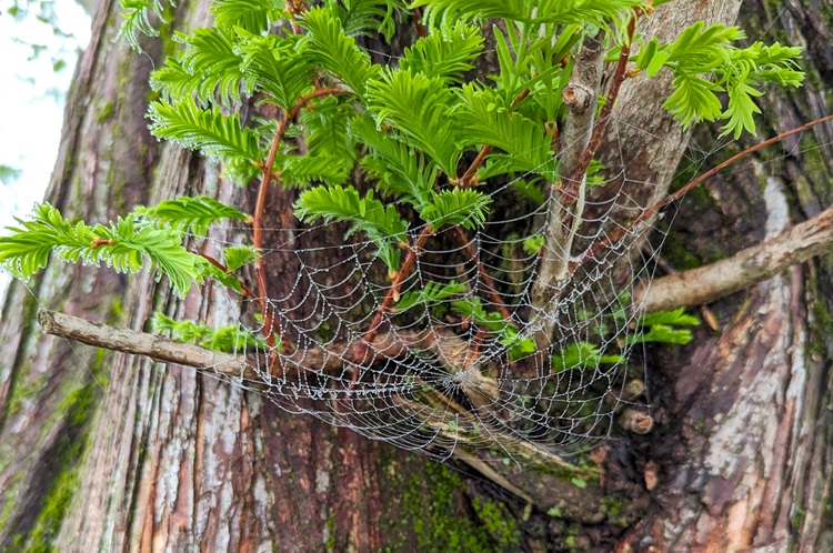 A dew-covered spider web on a bald cypress (Taxodium distichum).