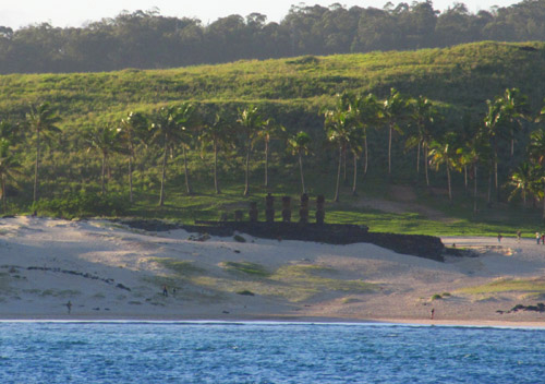 moai lined up on an ahu at the top of the beach area--more on the moai