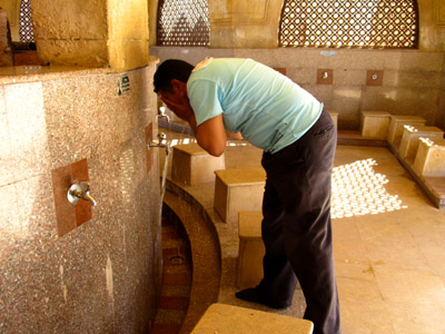 Mustafa demonstrates how to wash before a service. Often you wash your
