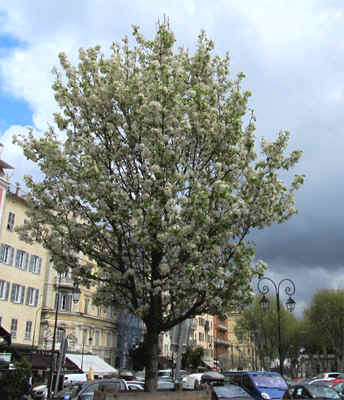 Springtime cherry blossoms decorate the downtown streets.