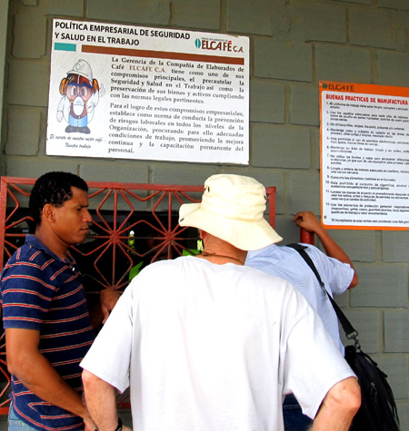 We got off the bus and stopped at a gate to the coffee factory to