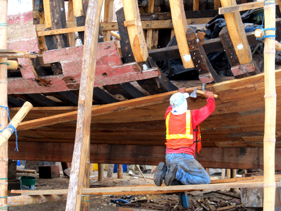 A repair job underway matches up the new planks within the existing