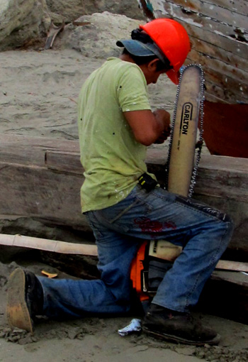 New planks are fashioned from logs with chainsaws.