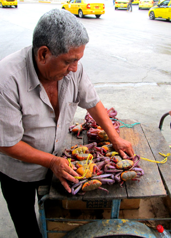 This man is tying his live crabs together. Several crates hold