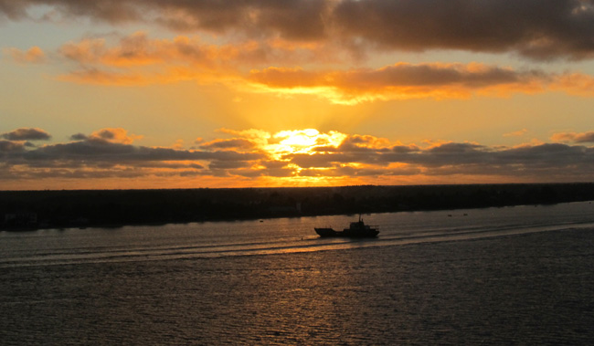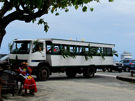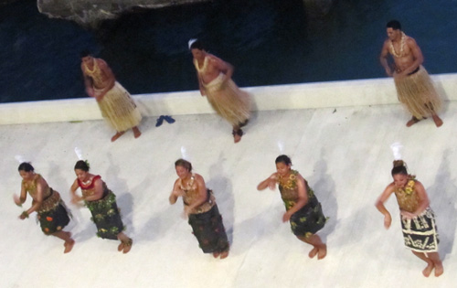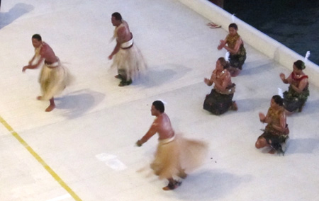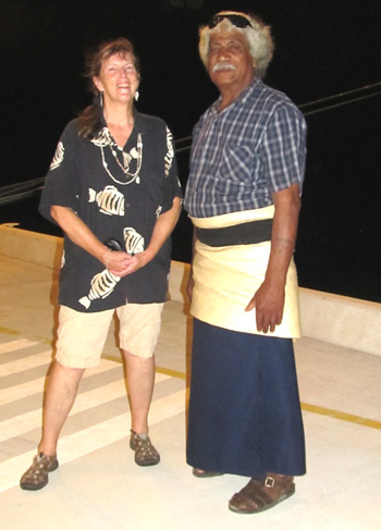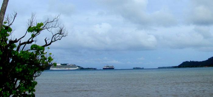 ~ ~ ~ After a planned day at sea, we got up early to observe the anchoring procedure at Raratonga of the Cook Islands. There were 2 possibilities—Plan A and plan B on different parts of the island—but neither one worked because of the huge swells, which would have made tendering a precarious exercise. On top of that, there was a storm brewing that would be located at our next planned stop after that. Sooo, the captain arranged for more dock time at our next port at Nuku Alofa, Tonga. We would be there from 7pm on Saturday until 4pm on Monday—our planned departure time, but after staying 2.5 days, not 8 hours. As a reward for our inconvenience, the captain provided free wine to all for dinner that night.