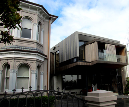 Next to the ornate Victorian house is one that's starkly modern.