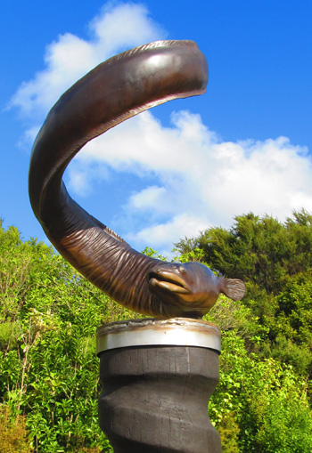A moray eel sculpture and a driftwood fish.