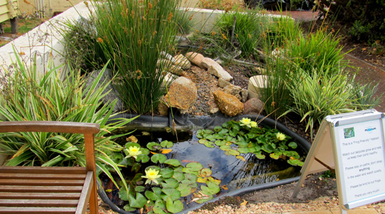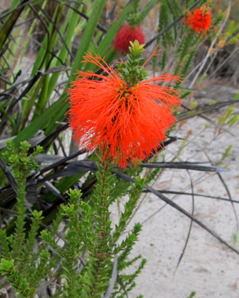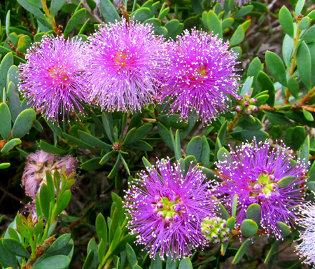ducks. A mimosa shrub with its powderpuff flowers decorates