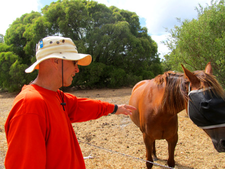 We talked to this horse with a fly mask covering its face when