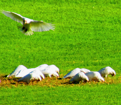 A group of sulphur-crested cackatoos were working on a golf