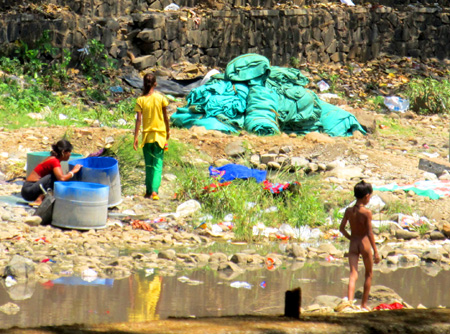 The young women clad in saris and flip-flops carried the pans