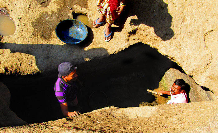were watching while several young men scraped dirt and gravel