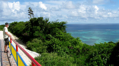 an odd railing painted with bright Antiguan colors.