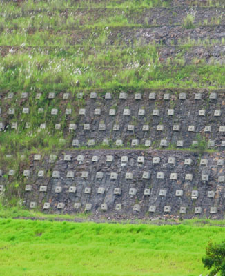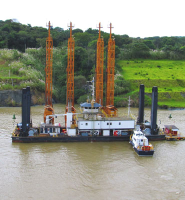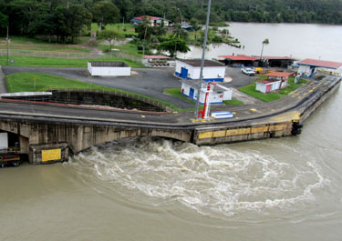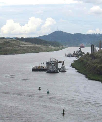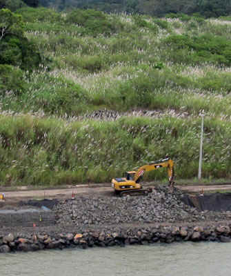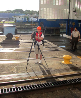 Ship photographers stepped ashore during our passage through the three Gatun locks to record our passage for the cruise video and for still photos. In front of the photographer you can see the close-up of the cogs between the mules' tracks--these are most needed for the steep inclines so they don't lose ground. The Gatun headquarters and welcome sign is on the incline of the third lock. After we're through the third lock we are in Gatun Lake. Looking to our right as we enter the lake, we can see the huge earthen dam with a concrete spillway into the Chagres River.