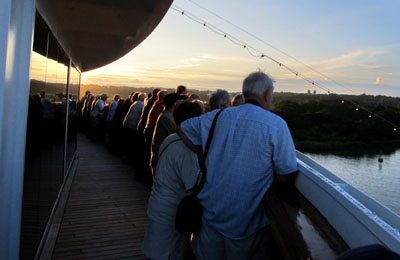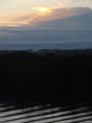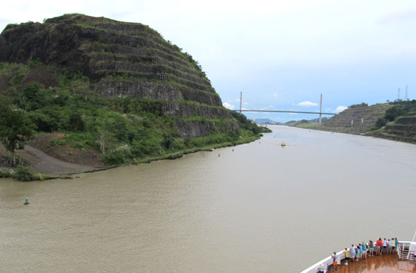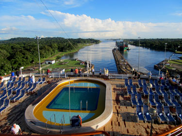 While we were paying close attention to the locks and all the activity surrounding their operations, once in a while we'd look at the broader view. It was a a beautiful day and the view from a higher deck looking back over the aft pool. There was a dense jungle on either side.