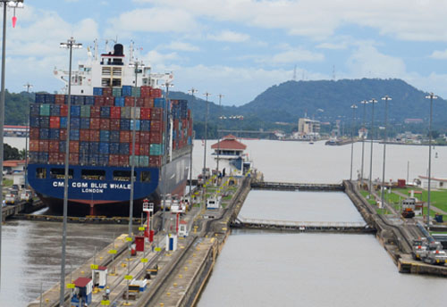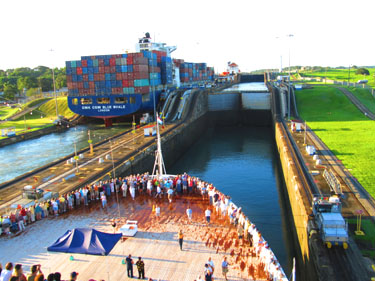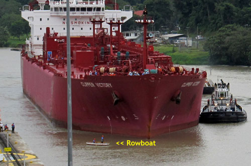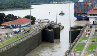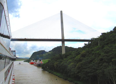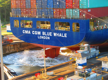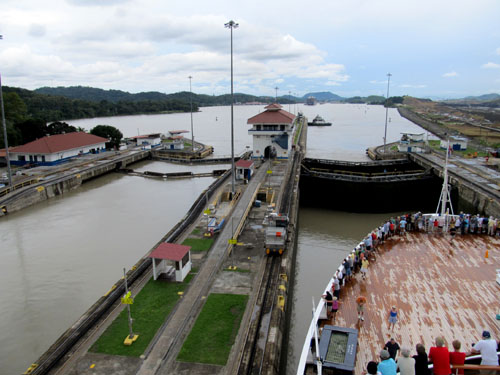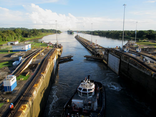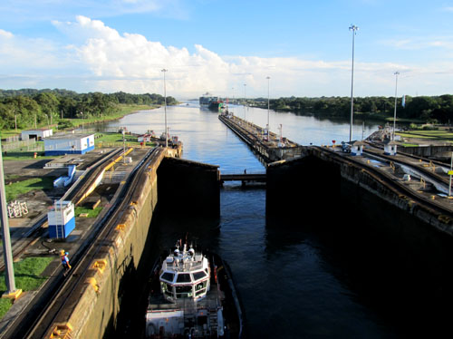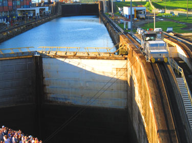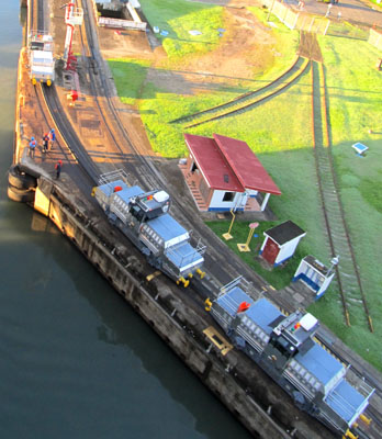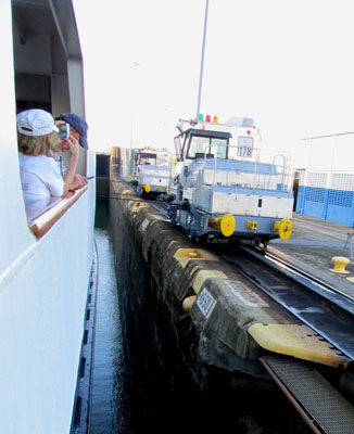 Looking forward as we enter the lock, our three starboard electric mules wait for our lines. There are three mules on each side with two toward the bow and one at the stern. There is not much spare room for our ship. (It's called a Panamax ship because they don't take ships any wider.) The mules' function is to keep a perfect tension between the two sides so we don't hit the sides of the locks. We move under our own power, though. A fully-loaded cargo ship, the CMA CGM Blue Whale from London, is ahead of us in the left-hand set of locks. We would follow the Blue Whale for the next eight hours. Looking behind our ship (See below.), one tug enters our lock and the single lane bridge closes behind it. Then the back doors of the lock close.