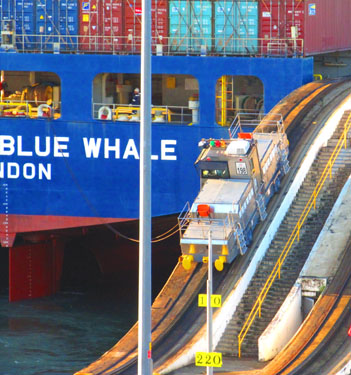 ![]() ![]() Meanwhile, the Blue Whale is ready to move to the third lock on its side. Its back mule climbs the steep incline and then you can see the water churning as it moves forward under its own power. |