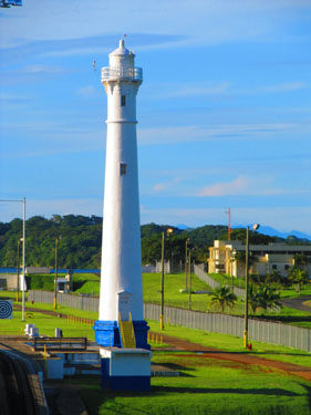 When the gates close, railings pop up and workers can cross from one side to the other. Warning bells ring as the gate is about to open. As we reach the Gatun control tower at the beginning of the second lock, one mule is returning through arched opening in the center, while our lead port mule is climbing its steep section up to the second lock. Also a lighthouse stands to our right as we pass through.