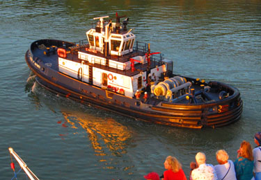 When we look back to the left, we see all the cranes where a third and larger set of locks are being constructed. With everything we know now, it will be much faster than the first time around, but considering all the original problems, the old locks work extremely well. Our tugboat gives itself a freshwater shower in the lake. As we look straight ahead there are several ships at anchor. Some are on a northward route and are waiting until the morning southbound ships are out of the locks, while others did not know their schedule in advance and are waiting for an open slot. The locks operate around the clock now since lights were installed in the 1960s.