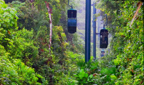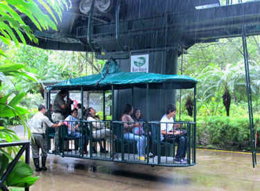 The tram is like a ski lift and we will ride it to the top of the mountain. As each car comes around, the attendants dump the rain puddles in the roof and then they wiped off the seats with a towel. There are eight people in each tram.
