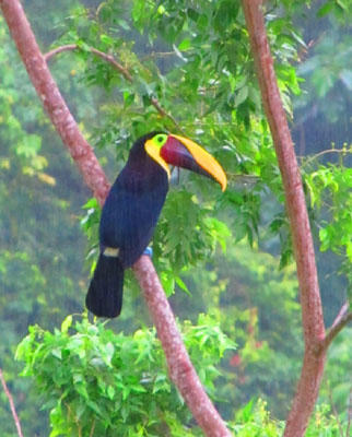 There is a guide at each stop to hook us onto the cables. There were ten zip lines in all and the longest one was over 1000' long. Some of the lines had more slope than others. In the photo below, I had stopped before I reached the platform, so I was pulling myself hand-over-hand up to get there. Sometimes the next zip line left from the same platform where we had just arrived, others zip lines were a walk through the woods. After one of these small hikes, a Toucan lit in a nearby tree while we waited for the guide to arrive. It was a nice moment. We loved the adventure of the zip lines and we received the full experience because rains fell the whole time we were zipping down the mountain and, as predicted, we were thoroughly soaked. After we were done with the zip lines, Roi walked us through the herb and edible garden.