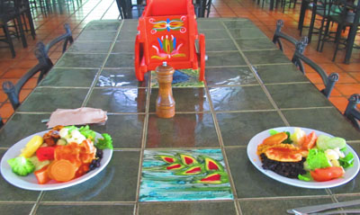 They served us a colorful lunch. The tables were all adorned with models of the traditional oxen carts. After lunch we continued to wander around the area and Dean decided to record some of these beautiful hand-painted tiles that were part of the table tops.