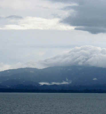 We're to meet our group at 6:20am, so we had an early breakfast and watched a brief sunrise before the clouds closed in. Our flags from left to right are: Holland America, yellow fever (we are healthy), Netherlands (Holland), and Costa Rica. |