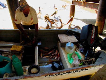 cleans his fish and feeds the guts to the awaiting pelicans.