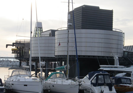 A concert stage next to the dock is being dismantled. It must have