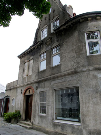 This garage near the white church is built into and from boulders.