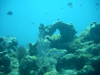 We saw a Nurse Shark (below), French Grunts (below, right), Blue Tangs (above, right), and many types of sponges (Barrel Sponges, above and Tube Sponges to the right.) |