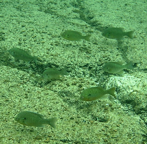 Besides the birds, we saw several species of turtles and fish. Below is a good sized Large-mouth Bass. To the right is a small school of Sunfish. |