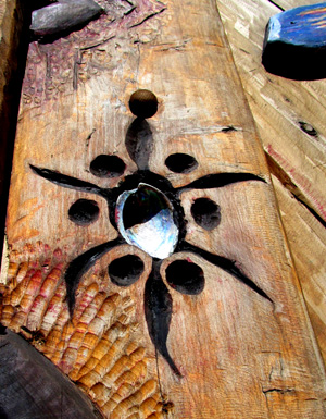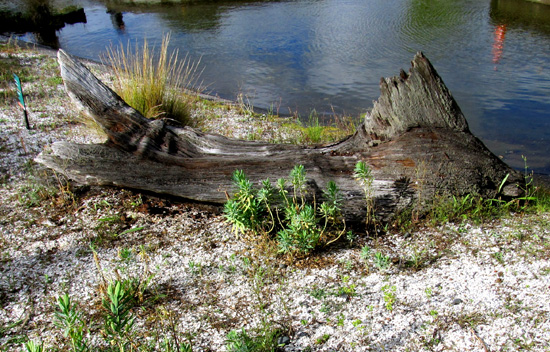 A moray eel sculpture and a driftwood fish.