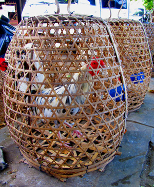 Roosters for sale and huge satellite dishes adorn tiny houses.
