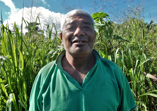 a large breadfruit tree, banana trees, papaya trees, and cassava