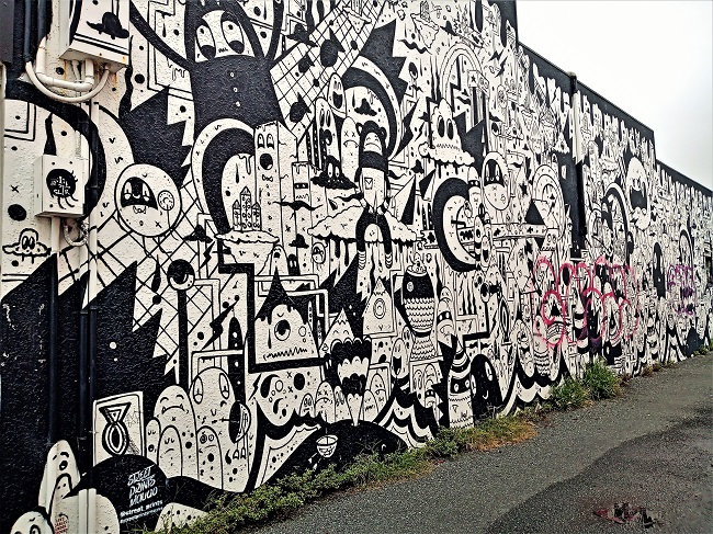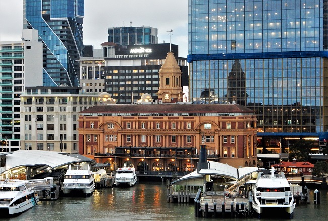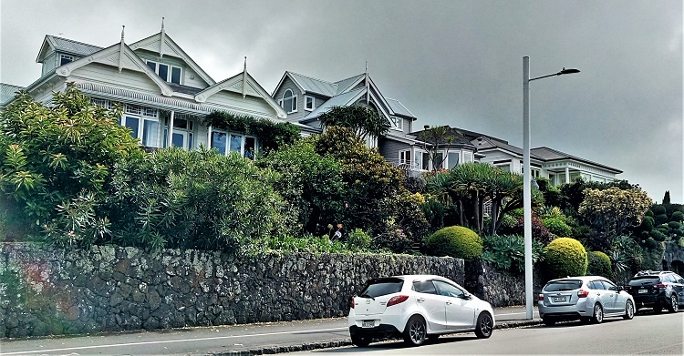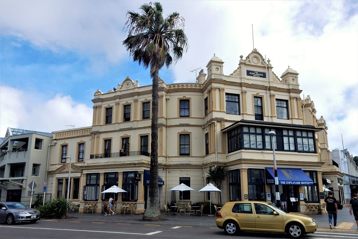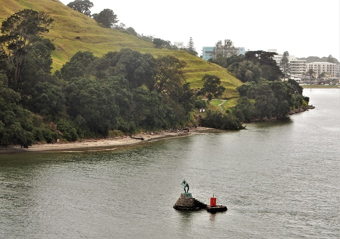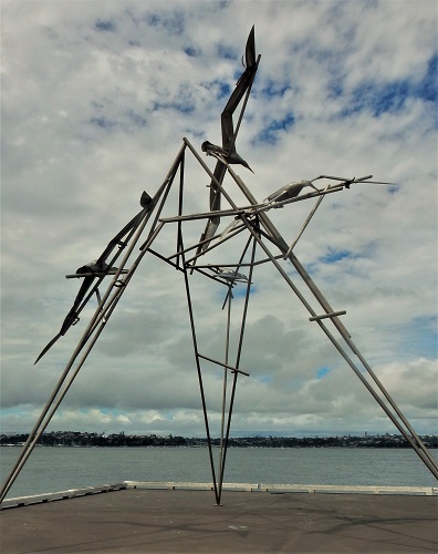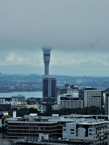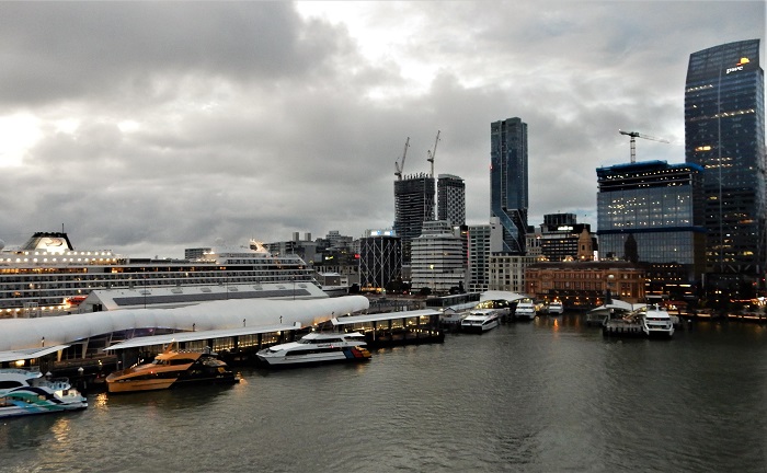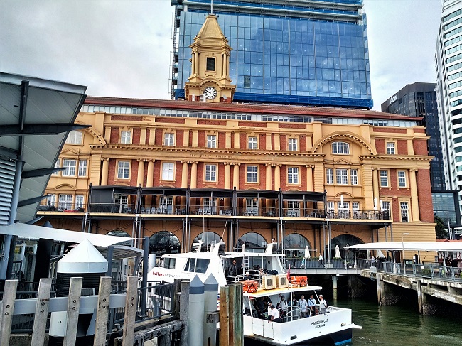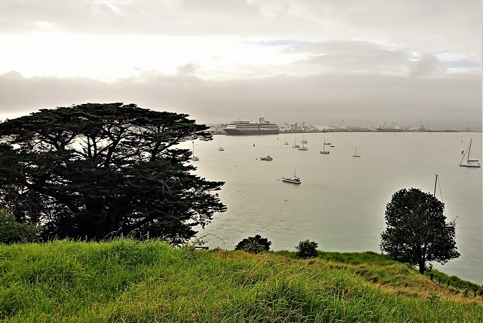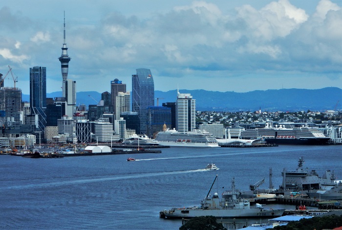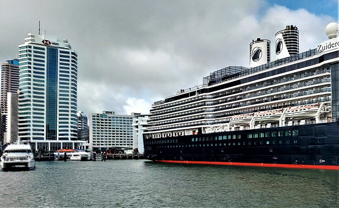 A shot back to Auckland shows the Viking ship and the Zuiderdam.