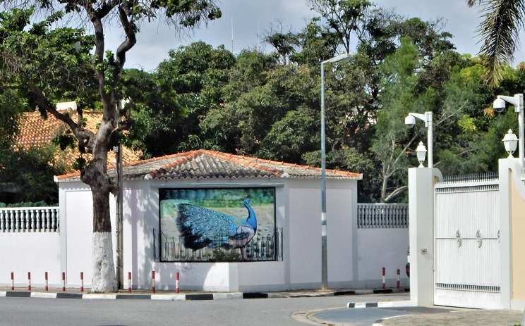 A peacock mosaic at the entry to a neighborhood where we finally