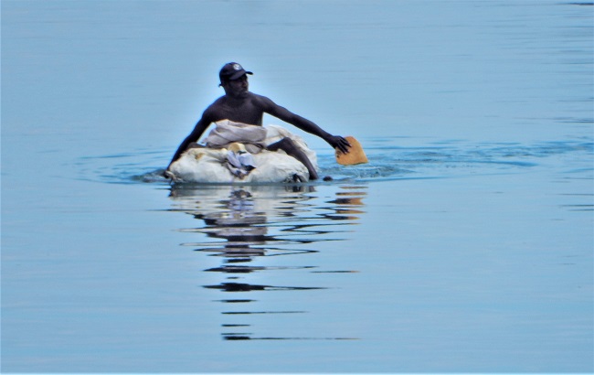 Using buckets for paddling a homemade craft gets the job done.