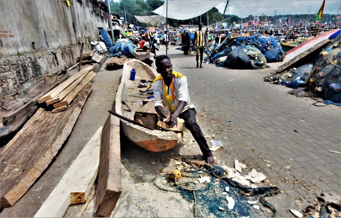 Guys maintaining and building boats. All of these fishing boats