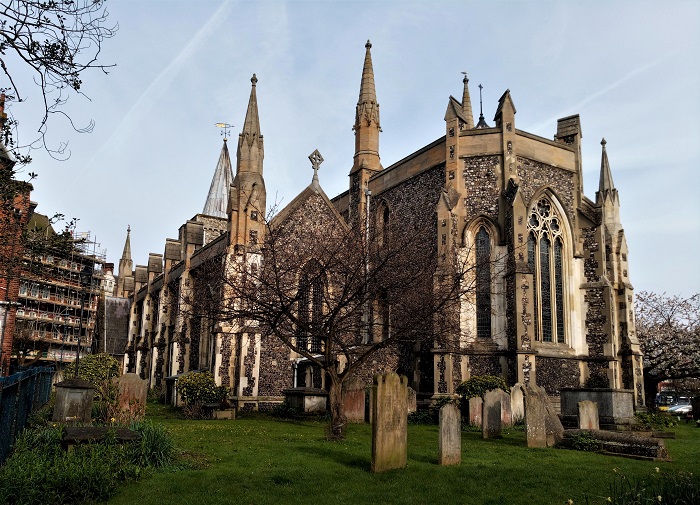 A classic red phone booth and a stone church in Southwell.