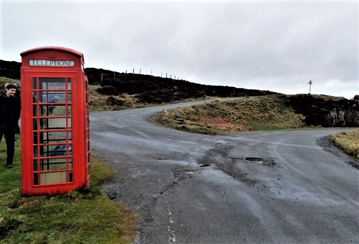 The red phone booth was the bus stop. A few others also got off